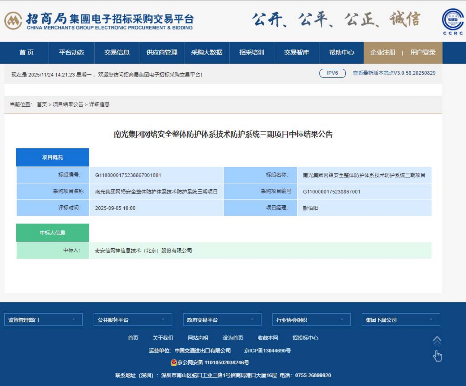南光集团网络安全整体防护体系技术防护系统三期项目中标结果公告