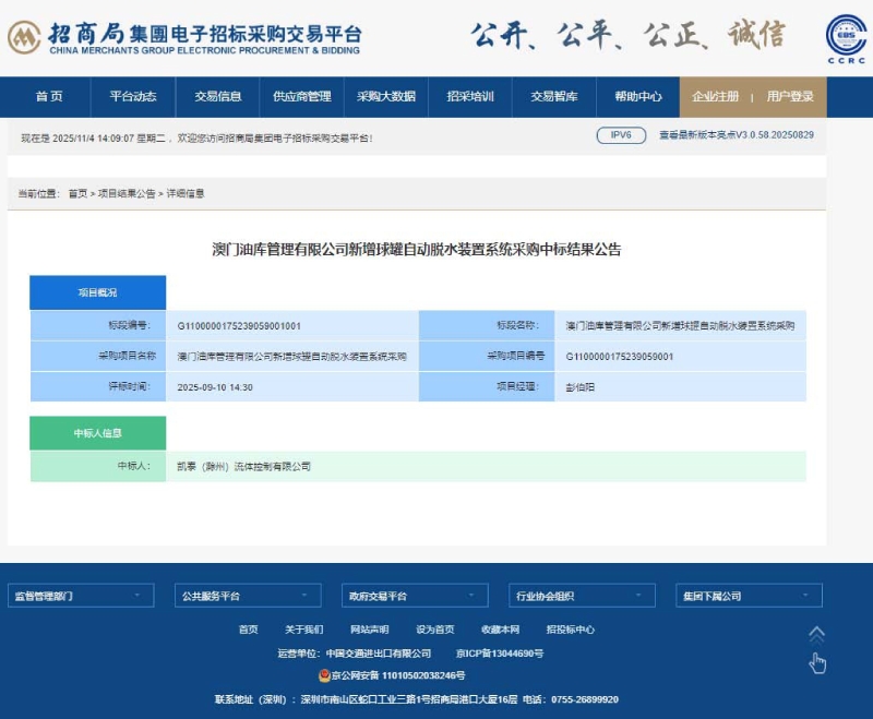 澳门油库管理有限公司新增球罐自动脱水装置系统采购中标结果公告